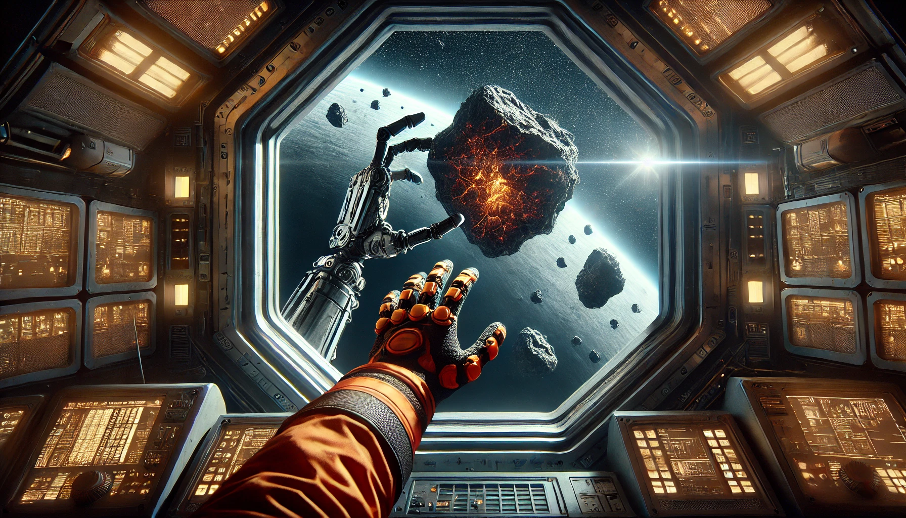 “Oh look! There’s one,” Alex exclaimed and they watched how the asteroid broke in half. One portion moved slightly away from the complex, the other right toward it, “That’s not supposed to happen.”
